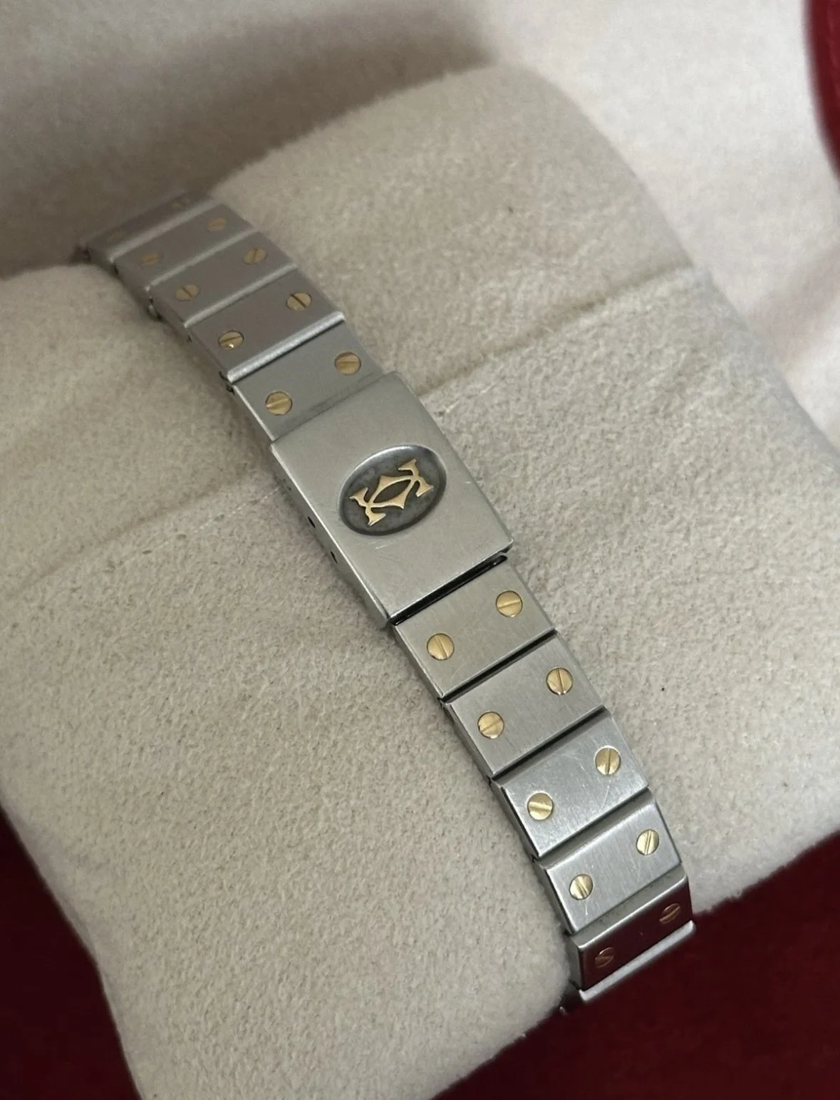 The crystal is beautifully preserved—clear and free from scratches—offering an unobstructed view of the dial. The original integrated bracelet measures approximately 16cm and sits comfortably on the wrist, maintaining the sleek, cohesive silhouette that defines the Santos line.