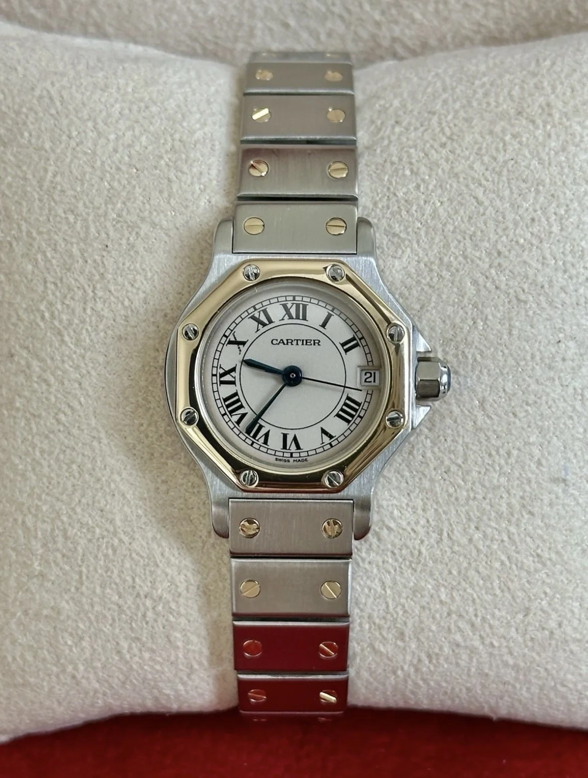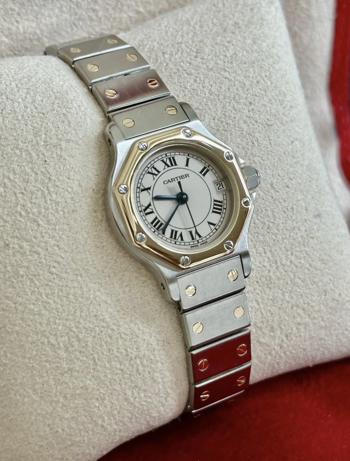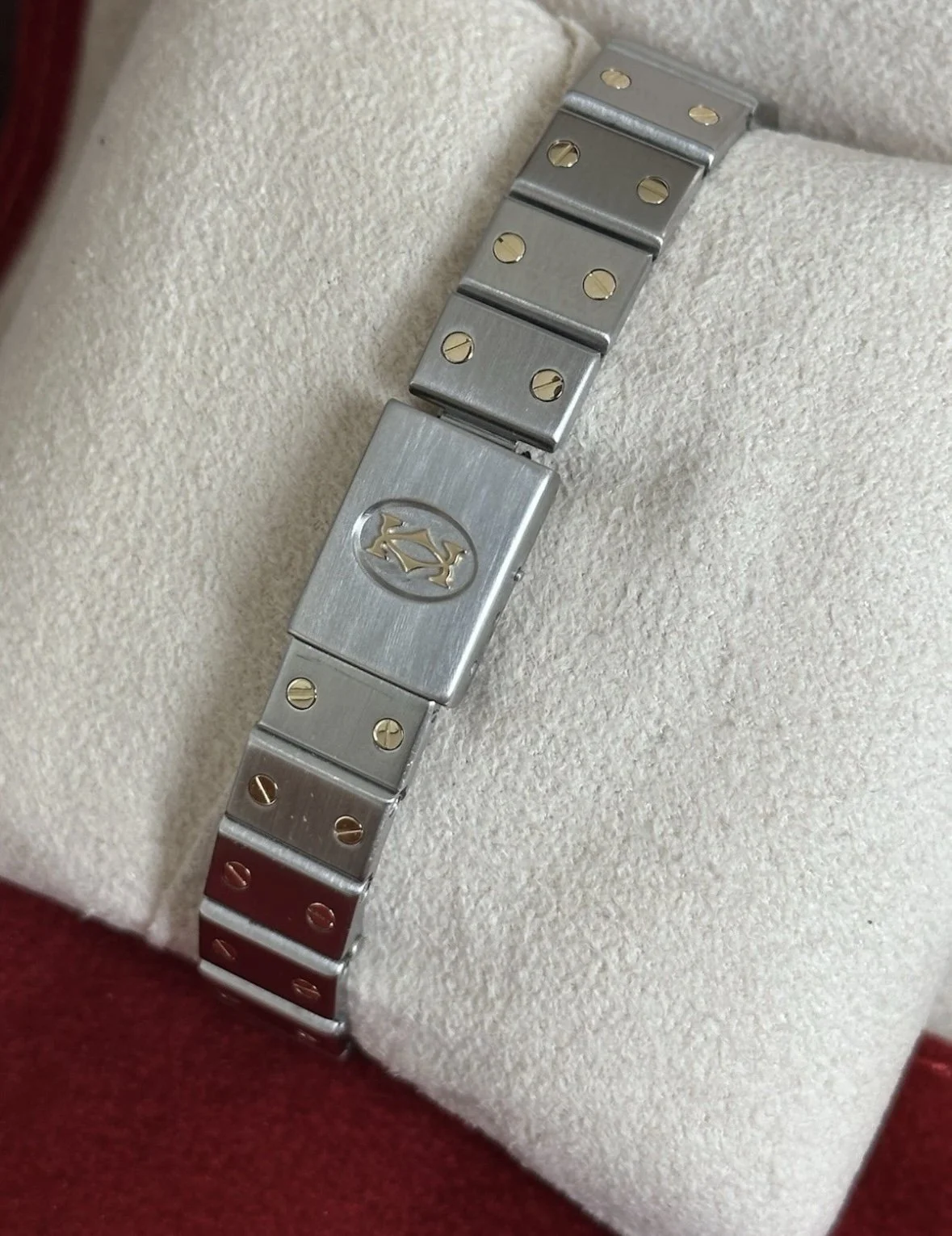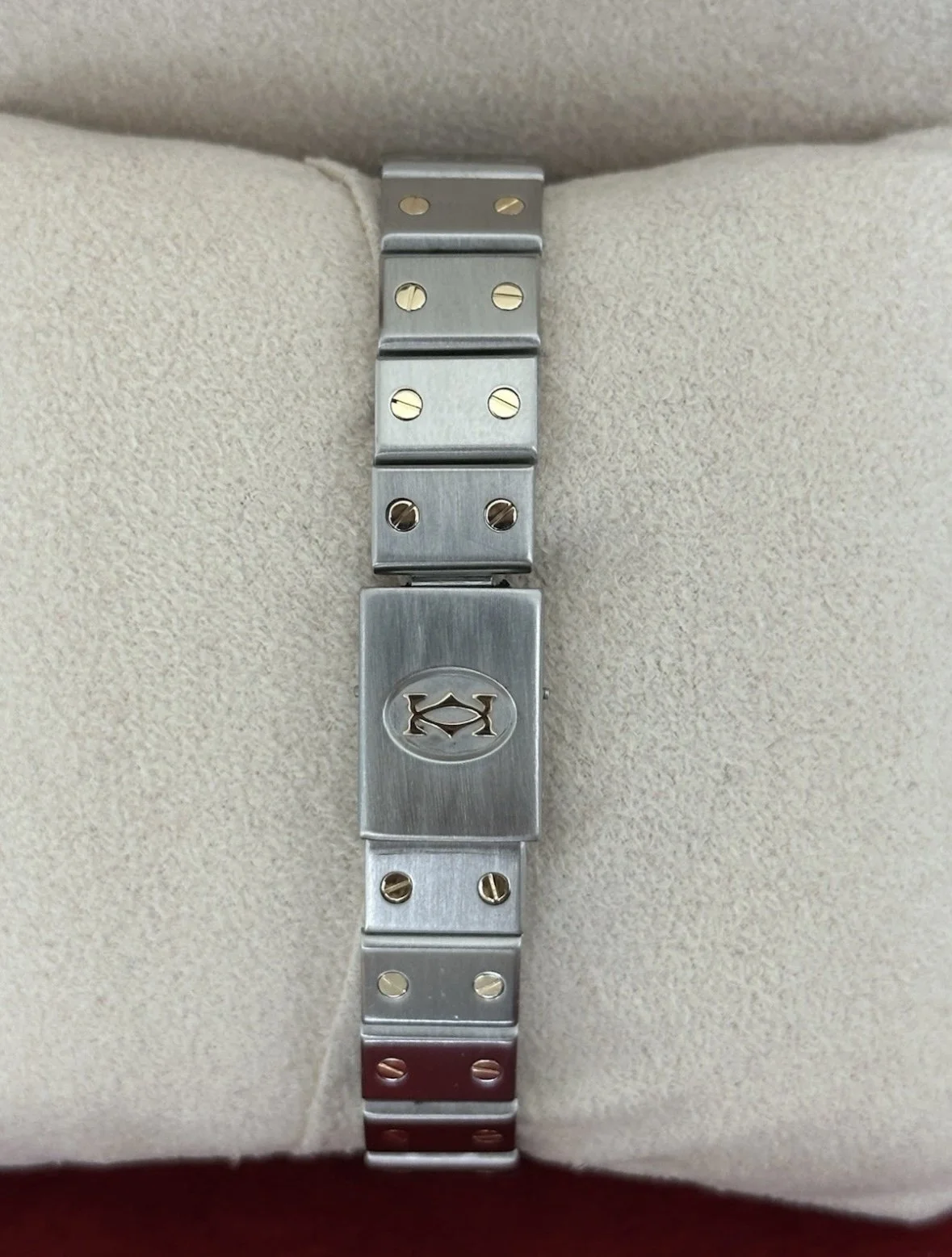 This Cartier Santos presents in lovely cosmetic condition, showing only minimal surface scratches to the case, bracelet, and bezel—consistent with careful wear.